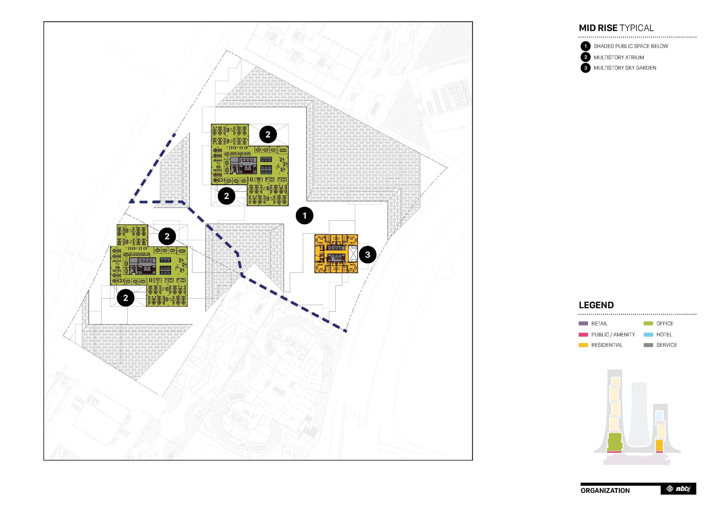 To unify the diverse programs within the towers, an elegant skin is designed to drape over the structures. This cohesive facade creates a rich spatial experience and establishes an iconic presence for the Square, making it a landmark of both aesthetic and functional excellence.